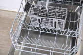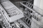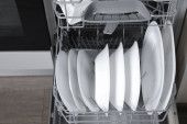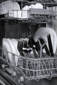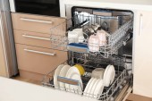 Otwarta zmywarka z brudną zastawą stołową w kuchni, zbliżenie