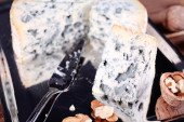 Ser pleśniowy z gałązek rozmarynu i orzechy na pokładzie z nożem i drewniany stół tło