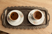 Tradycyjna piankowa kawa turecka we wzorzystej białej filiżance w metalowej tacy na dębowym stoliku