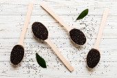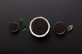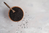 nasiona komosy w misce i łyżce na kolorowym tle. Zdrowa kinwa w małej misce. Zdrowa superżywność.