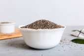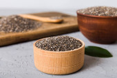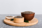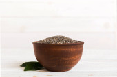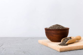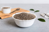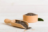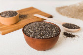Nasiona szałwii w misce i łyżce na kolorowym tle. Zdrowa hispanika Salvia w małej misce. Zdrowa superżywność.
