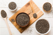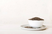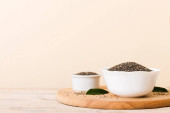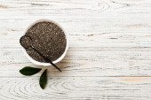 Nasiona szałwii w misce i łyżce na kolorowym tle. Zdrowa hispanika Salvia w małej misce. Zdrowa superżywność.