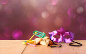 Hamantaschen ciasteczka lub hamans uszy i maski na święto Purim (święto żydowskie)