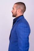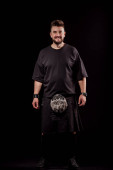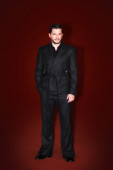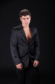 męski portret w studio na czarnym tle; ubrany w czarny garnitur biznesowy; spogląda w kamerę