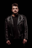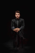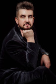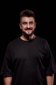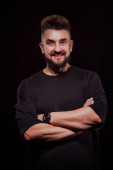 męski portret w studio na czarnym tle; ubrany w czarną bluzę z kapturem; spogląda w kamerę