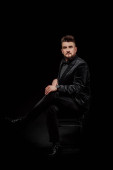 portret mężczyzny w studio na czarnym tle; w czarnej skórzanej kurtce; patrzy w kamerę