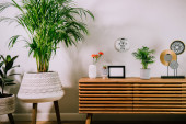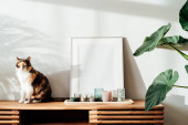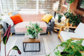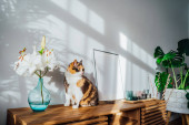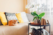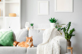 Zdjęcie "Wielokolorowy kot zwierzak śpi na szarej kanapie w nowoczesnym skandynawskim wnętrzu salonu z wieloma roślinami zielonego domu. Styl biofilii. Przytulne, hygge wnętrz domowych. Skupienie selektywne." może być wykorzystywane do celów osobistych i komercyjnych zgodnie z warunkami zakupionej licencji Royalty-free. Obraz jest dostępny do pobrania w jakości wysokiej rozdzielczości do 5760x3840.