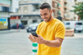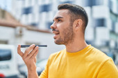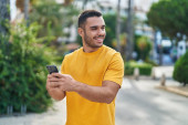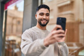 Zdjęcie "Młody Latynos uśmiecha się pewnie robiąc selfie przy smartfonie na ulicy" może być wykorzystywane do celów osobistych i komercyjnych zgodnie z warunkami zakupionej licencji Royalty-free. Obraz jest dostępny do pobrania w jakości wysokiej rozdzielczości do 5760x3840.