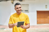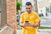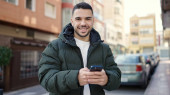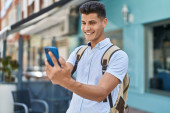 Młody Latynos uśmiecha się pewnie robiąc selfie przy smartfonie na ulicy