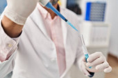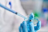 Młody Afroamerykanin w mundurze naukowca używający pipety w laboratorium