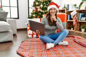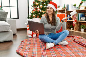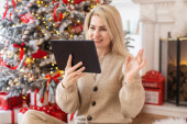 Biała kobieta w średnim wieku patrząc obraz stojący obok choinki w domu