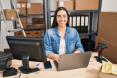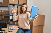 Zdjęcie "Młoda blondynka pracuje w małym biznesie e-commerce pokazując i wskazując palcami numer dwa uśmiechając się pewny siebie i szczęśliwy. " może być wykorzystywane do celów osobistych i komercyjnych zgodnie z warunkami zakupionej licencji Royalty-free. Obraz jest dostępny do pobrania w jakości wysokiej rozdzielczości do 5760x3840.