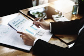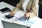 Bizneswoman używająca długopisu do wykresu dokument bada zarobki dotknięte pandemią koronawirusa, aby dostosować swoją strategię rynkową