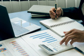 Bizneswoman używająca długopisu do wykresu dokument bada zarobki dotknięte pandemią koronawirusa, aby dostosować swoją strategię rynkową