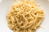 żółty pieprz pesto spaghetti pokryte tartym serem mozzarella w czarnej misce na białym tle