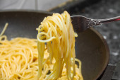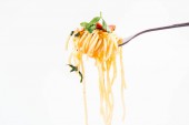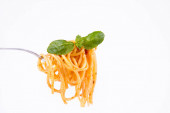 Pieprz żółty pesto spaghetti pokryty tartym serem mozzarella ozdobionym kolendrą zwijaną wokół widelca