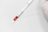 Kobieta w rękawiczce z zakrwawionym skalpelem na białym tle. Szeroki ekran. Przestrzeń chroniona