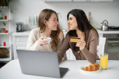 Uśmiechnięta kobieta trzymająca kartę kredytową w pobliżu dziewczyny z filiżanką kawy w kuchni, baner