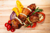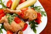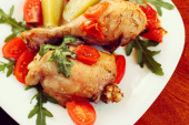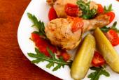 Kurczak pieczony na białe płytki na drewnianym stole
