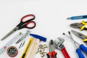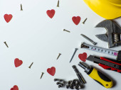 Narzędzia budowlane na białym tle z przestrzenią do kopiowania. Karta z życzeniami budowlanymi. Do reklamy lub projektowania stron internetowych. Napraw dom. Układy płaskie