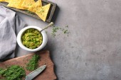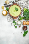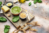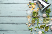 Green basil pesto with italian recipe ingredients, Basil, olive oil, parmesan, garlic, pine nuts. banner, menu, recipe place for text, top view,