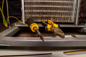 Zdjęcie "Aluminiowa siatka do skraplacza miedzi agregatu chłodniczego. Naprawa lodówki. Rurociągi chłodnicze. Chłodnica. Obsługa serwisowa. Naprawa klimatyzatorów. Przemysł." może być wykorzystywane do celów osobistych i komercyjnych zgodnie z warunkami zakupionej licencji Royalty-free. Obraz jest dostępny do pobrania w jakości wysokiej rozdzielczości do 5760x3840.