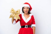 Zdjęcie "Młoda Latynoska kobieta ubrana jak mama Noel trzymająca świąteczny łuk na białym tle wskazując na bok, aby przedstawić produkt" może być wykorzystywane do celów osobistych i komercyjnych zgodnie z warunkami zakupionej licencji Royalty-free. Obraz jest dostępny do pobrania w jakości wysokiej rozdzielczości do 5760x3840.