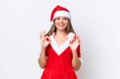 Młoda Latynoska kobieta ubrana jak mama Noel trzymająca świąteczny łuk na białym tle wskazując na bok, aby przedstawić produkt