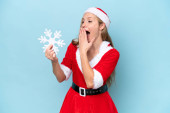 Młoda Latynoska ubrana jak mama Noel trzymająca płatki śniegu odizolowane na niebieskim tle mając wątpliwości podczas patrzenia w górę