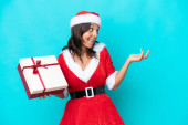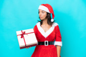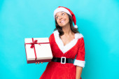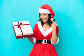 Młoda Latynoska kobieta przebrana za mamusię Noel trzyma prezent odizolowany na niebieskim tle dając kciuki w górę gest