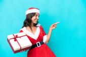 Młoda Latynoska kobieta ubrana jak mama Noel trzyma prezent odizolowany na niebieskim tle śmiejąc się w pozycji bocznej