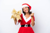 Młoda Latynoska kobieta ubrana jak mama Noel trzymająca worek odizolowany na niebieskim tle myśląc o pomyśle patrząc w górę