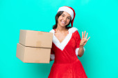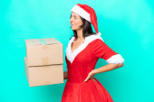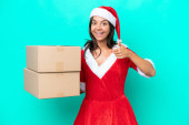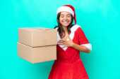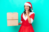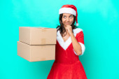 Młoda Latynoska kobieta ubrana jak mama Noel trzyma karton odizolowany na niebieskim tle patrząc w górę i z zaskoczonym wyrazem