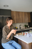 Smiley azjatycki młody człowiek gotowanie chiński lub tajwański pomidor jajecznica jaja w kuchni.