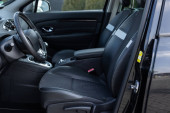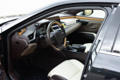 Nowoczesny i futurystyczny samochód elektryczny SUV z dużą deską rozdzielczą z ekranem dotykowym, kołem. Robotyczny samochód przyszłości. Nowoczesny rozwój technologiczny. Wnętrze samochodu z przednimi siedzeniami, tekstylia, drzwi, konsola.
