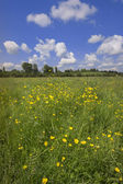 Pole z zieloną trawą i żółte kwiaty przeciw błękitne niebo