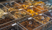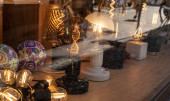 stoisko rynkowe kamieni szlachetnych w pudełkach. Kamienie mineralne do uzdrawiania, ołtarz, medytacja, reiki, praktyka duchowa, rytuał, czary.