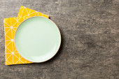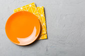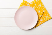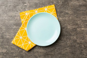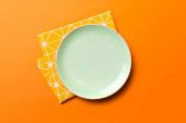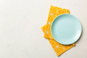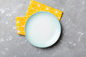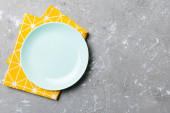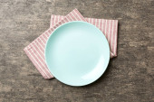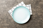 Widok z góry na kolorowe tło puste okrągłe Niebieski talerz na obrus do żywności. Puste naczynie na serwetce z miejscem na projekt.