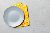 Zdjęcie "Widok z góry na kolorowe tło puste okrągłe Niebieski talerz na obrus do żywności. Puste naczynie na serwetce z miejscem na projekt." może być wykorzystywane do celów osobistych i komercyjnych zgodnie z warunkami zakupionej licencji Royalty-free. Obraz jest dostępny do pobrania w jakości wysokiej rozdzielczości do 5760x3840.