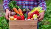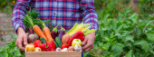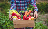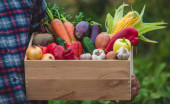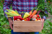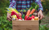 Zdjęcie "Farmer trzyma pudełko świeżo zebranych warzyw. Przyroda. ukierunkowanie selektywne" może być wykorzystywane do celów osobistych i komercyjnych zgodnie z warunkami zakupionej licencji Royalty-free. Obraz jest dostępny do pobrania w jakości wysokiej rozdzielczości do 5760x3840.