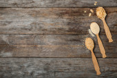 Łyżki z brązowym cukrem granulowanym na jasnodrewnianym stole, płaskie ułożenie. Miejsce na tekst