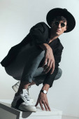 Dramatyczny biznesmen patrzy w dół, wkłada jedną rękę do kieszeni, zamyka kurtkę i nosi pierścionek i okulary przeciwsłoneczne na białym tle studia.