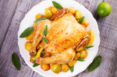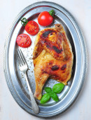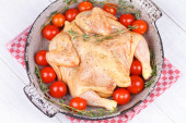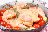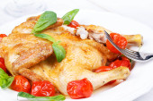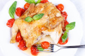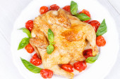 Pieczonego kurczaka z pomidorami cherry, zielony bazylią i czosnkiem