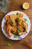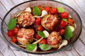 Pieczonego kurczaka z pomidorami cherry, zielony bazylią i czosnkiem