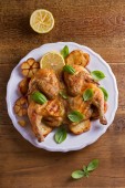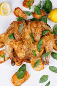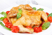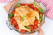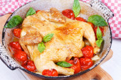 Pieczonego kurczaka z pomidorami cherry, zielony bazylią i czosnkiem