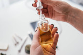Kobieta trzymająca kroplomierz butelki z serum używanej do pielęgnacji skóry