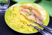 Płyta Risotto krewetki przyozdobionym z świeżej pietruszki i papryka chili