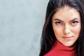 Zdjęcie "Modna młoda kobieta. Portret pięknej modelki z długimi włosami i makijażem. Piękno młody biały kobieta z czarny fryzura na tle szary ściana" może być wykorzystywane do celów osobistych i komercyjnych zgodnie z warunkami zakupionej licencji Royalty-free. Obraz jest dostępny do pobrania w jakości wysokiej rozdzielczości do 5760x3840.