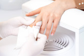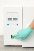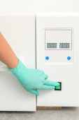 Kosmetyk w rękawiczkach ochronnych uruchamia maszynę do dezynfekcji narzędzi przed zabiegiem medycznym