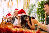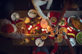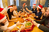 Tabela pieczonego indyka i żywności w Boże Narodzenie i Nowy Rok partii amerykańskiej rodziny w domu, członek rodziny cieszyć się domowej roboty grill turkry jadalnia zebrać się w domu